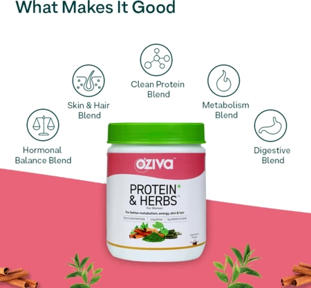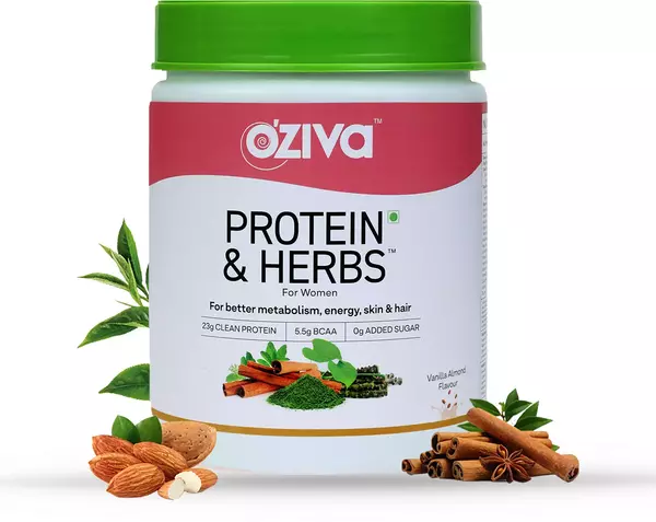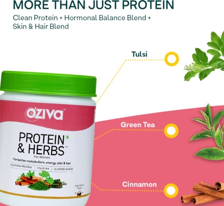 OZiva Protein & Herbs for Women packs 23g of Clean Protein (cold processed whey protein), 5.5g BCAA with essential Multivitamins, Minerals, and Ayurvedic Herbal extracts.